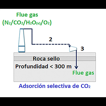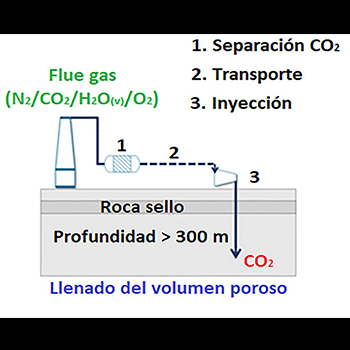 Este proceso, conocido como Carbon Capture and Storage, por sus siglas en inglés, toma los gases de combustión de la industria, separa el CO2, lo transporta e inyecta en yacimientos con profundidades superiores a 300 m (800 m aproximadamente), en cuyas condiciones de presión y temperatura, tiene el comportamiento parecido a un líquido y llena el volumen libre de la roca.