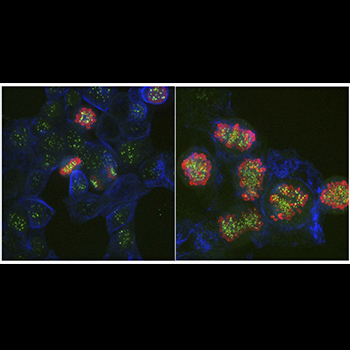 En la siguiente imagen: Las células haploides consiguen dividirse en presencia del compuesto DAB (izquierda) mientras que aquellas que tienen un mayor número de cromosomas no son capaces de hacerlo (derecha). Como consecuencia, las células haploides sobreviven en presencia de DAB mientras que las que tienen un mayor número de cromosomas terminan por desaparecer en cultivos de laboratorio. (Imágenes: CNIO) Ver imagen